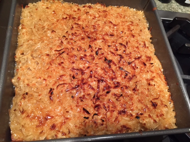 - Remove from oven and while still hot, spread with coconut frosting. Return to broiler and brown to toast the coconut.