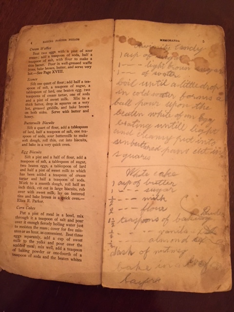 Unusual in its small, handy size, with crumbling parchment papers, this delicate book is a treasure trove of recipes along with facing blank pages for the cook to add her own twist. Recipes such as Cherry Roly Poly, Lamb Kidney en Brochette and Asparagus Loaf with Yellow Bechamel Sauce are even thrice tested in this 1909 publication. Was this the early “Joy of Cooking” for the American housewife at this time? Carrie must have loved to cook because her little book was full of handwritten recipes and notes.