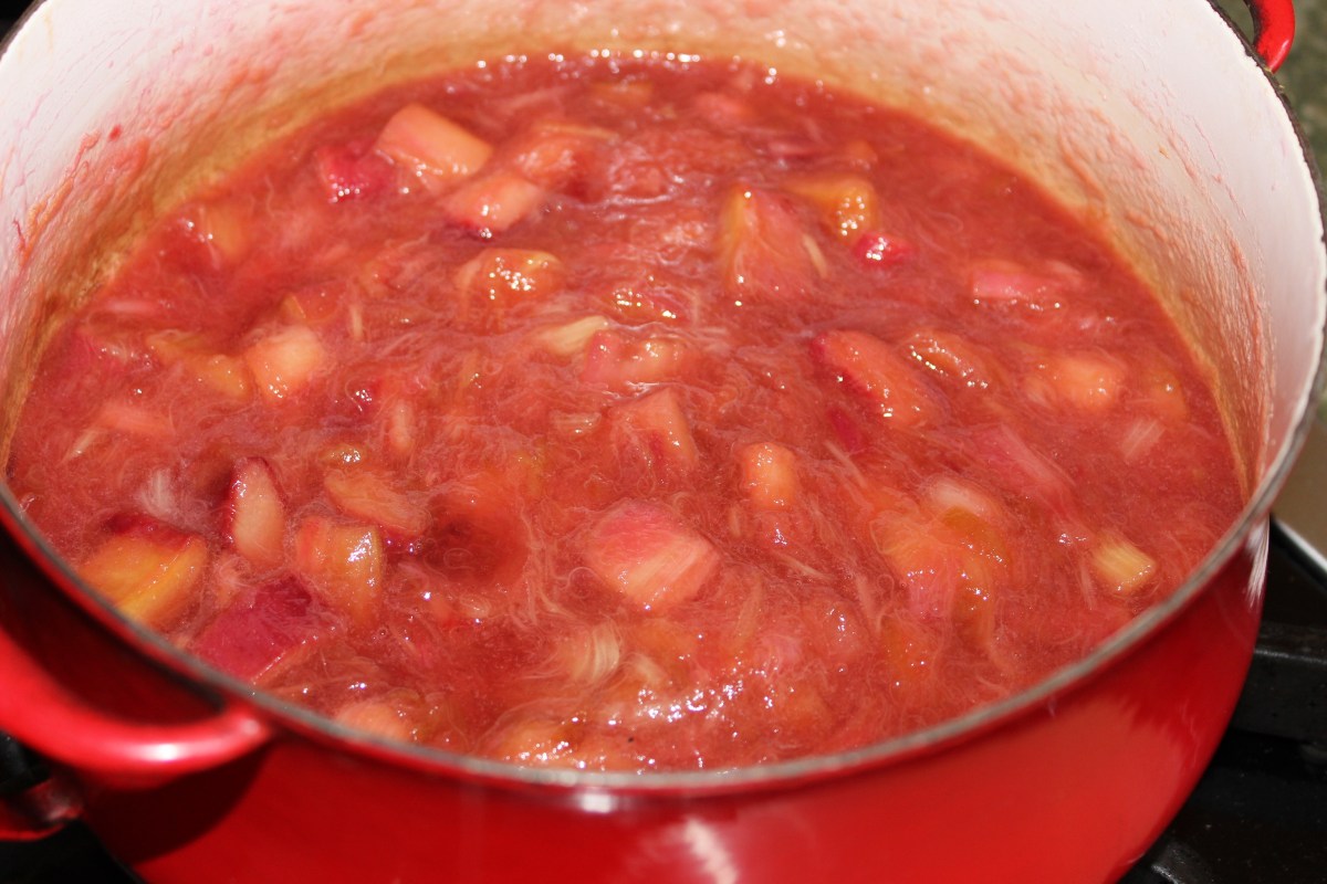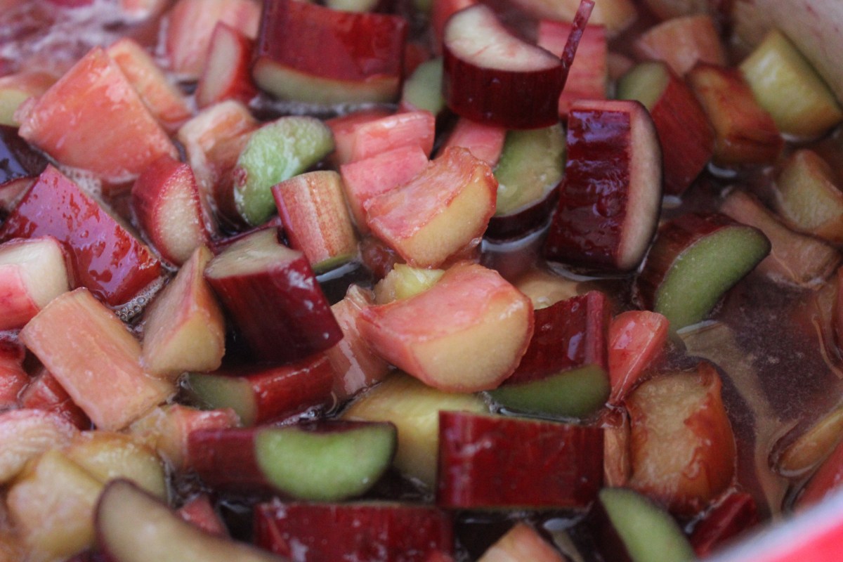 - Cook on medium heat for about 10 minutes. The rhubarb will break down. This is the reason I cut it into such large pieces.