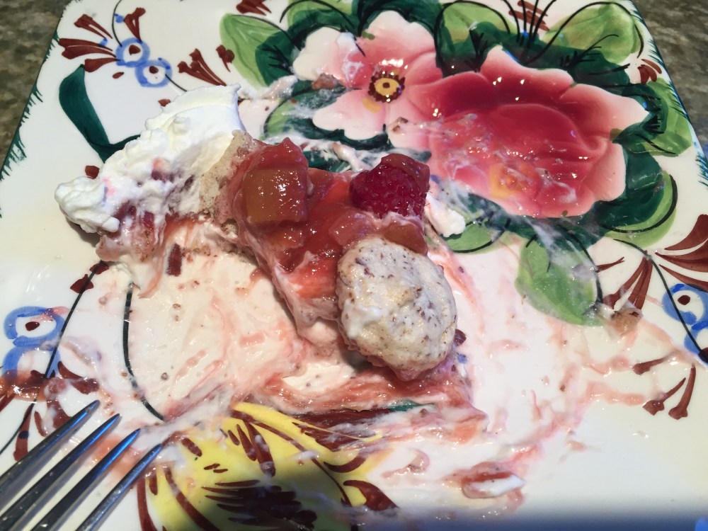 - Repeat with another meringue, rhubarb compote, cream and raspberries.