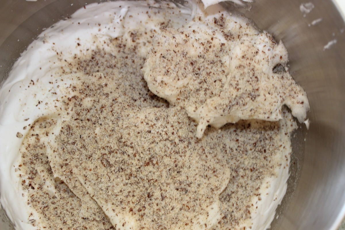 - Beat egg whites until foamy and starting to hold together. Slowly add the remaining half of the sugar—75 grams. Beat until glossy about 5 minutes total time.