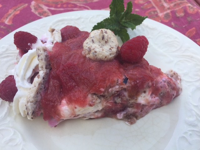 - Place the last layer on top and spread with remaining rhubarb. Sprinkle the remaining raspberries on top and voila!