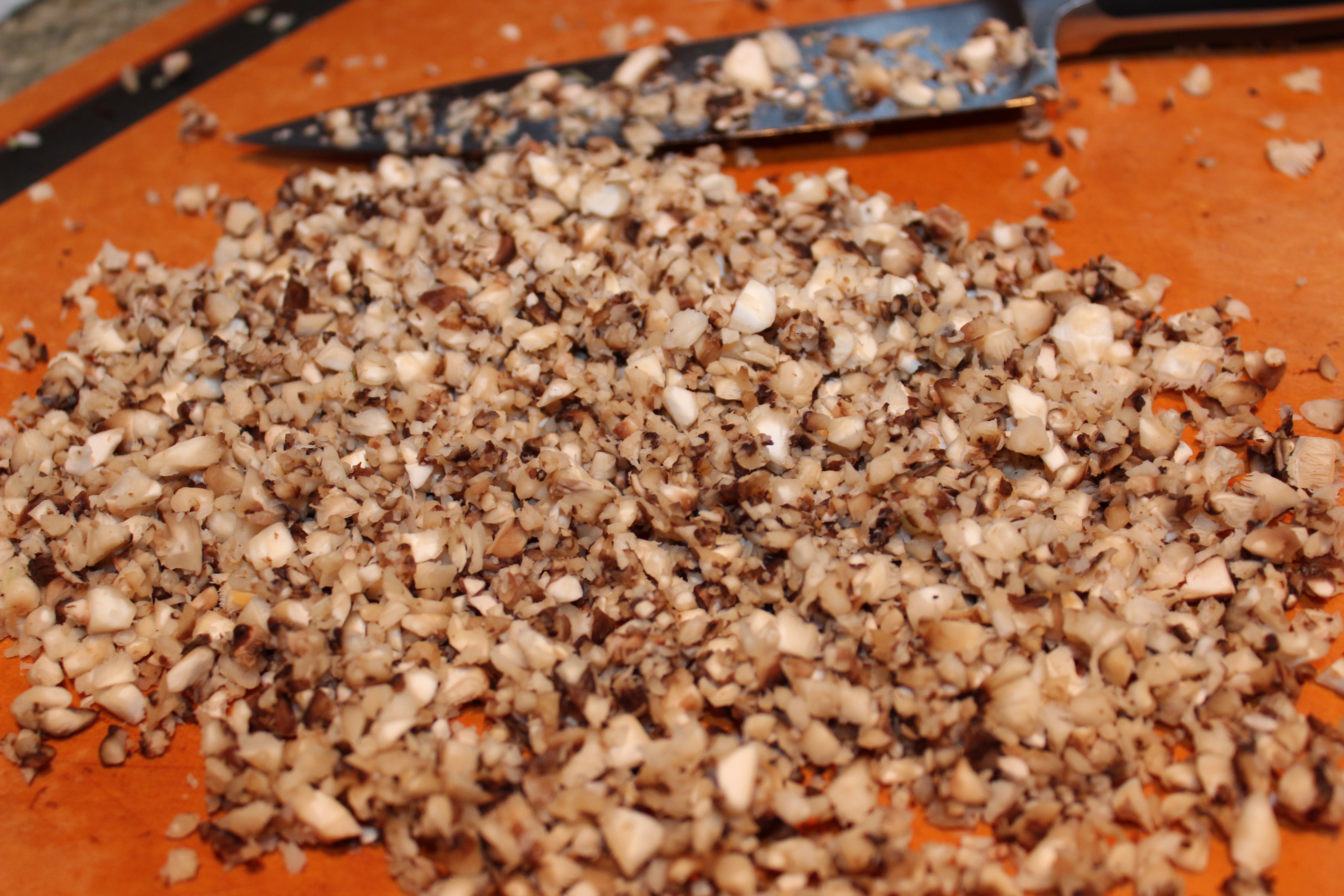 When the duxelles are finished, stir in the shreds of Swiss chard and a pinch of herbes de Provence and saute until cooked but still bright green. Do not overcook! You can make this ahead if you like and refrigerate. To add even more color, dice fresh Roma tomatoes to small, 1/4” cubes that will also take part in this production.