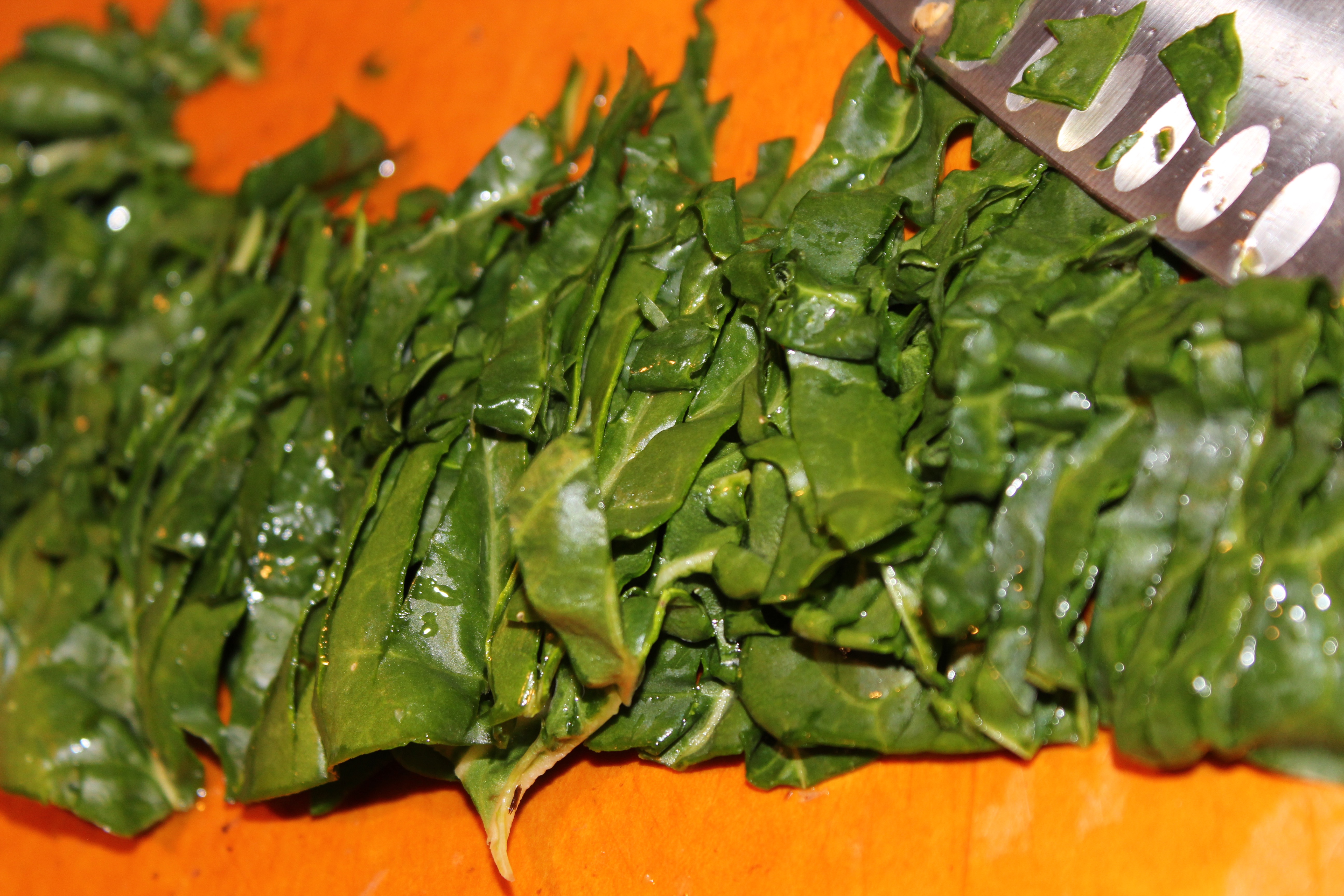 Next, I harvested fresh Swiss chard from my garden. I needed an excuse to use this green that has over-populated and decided to become a permanent, year-round fixture. Not necessarily a bad thing. The chard’s lineage was removed for future use and the leaves folded in half, sliced down either side to create three long pieces, then thinly sliced. You can maneuver this anyway you like. This is just how I do it to help get it to the lowest common denominator.