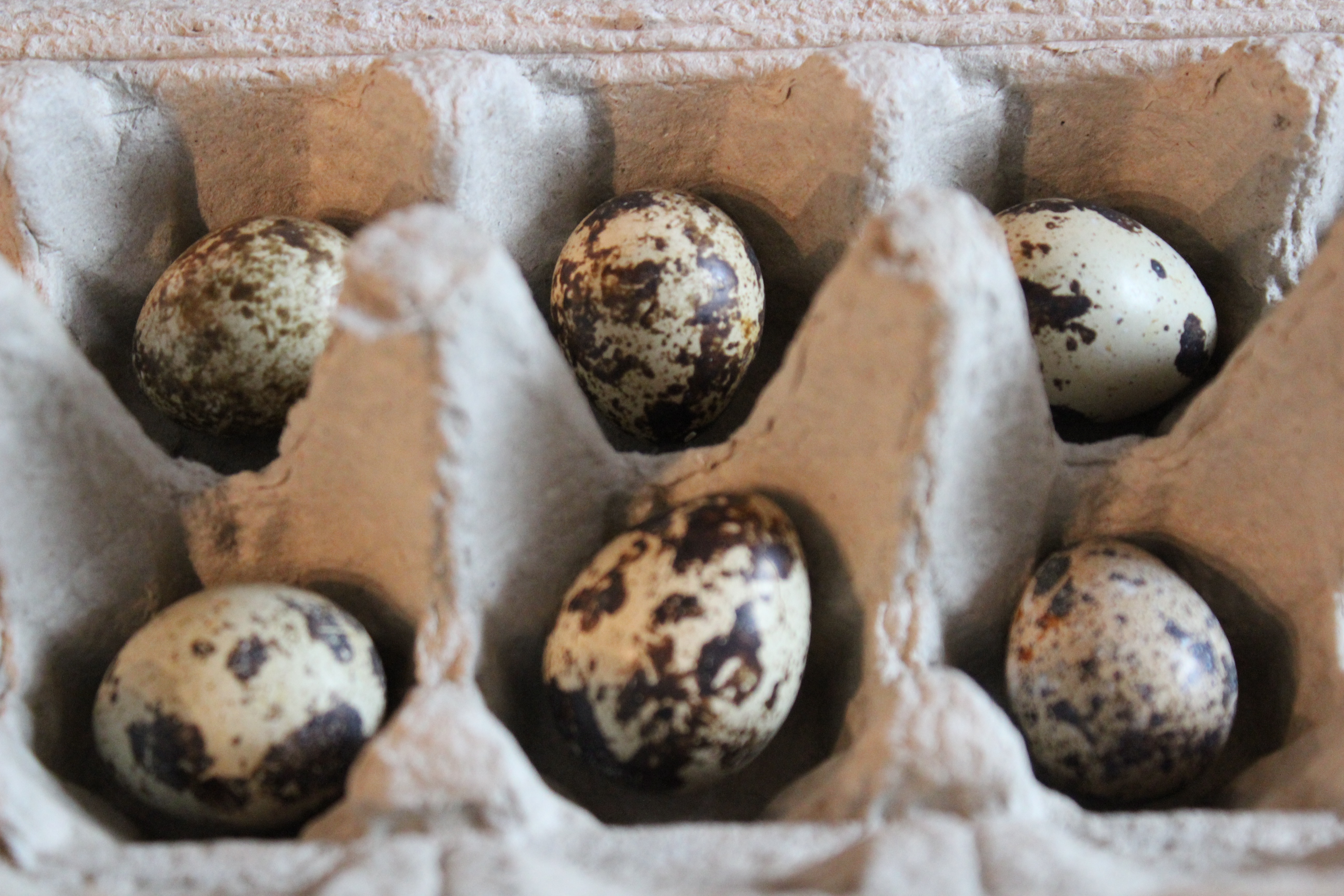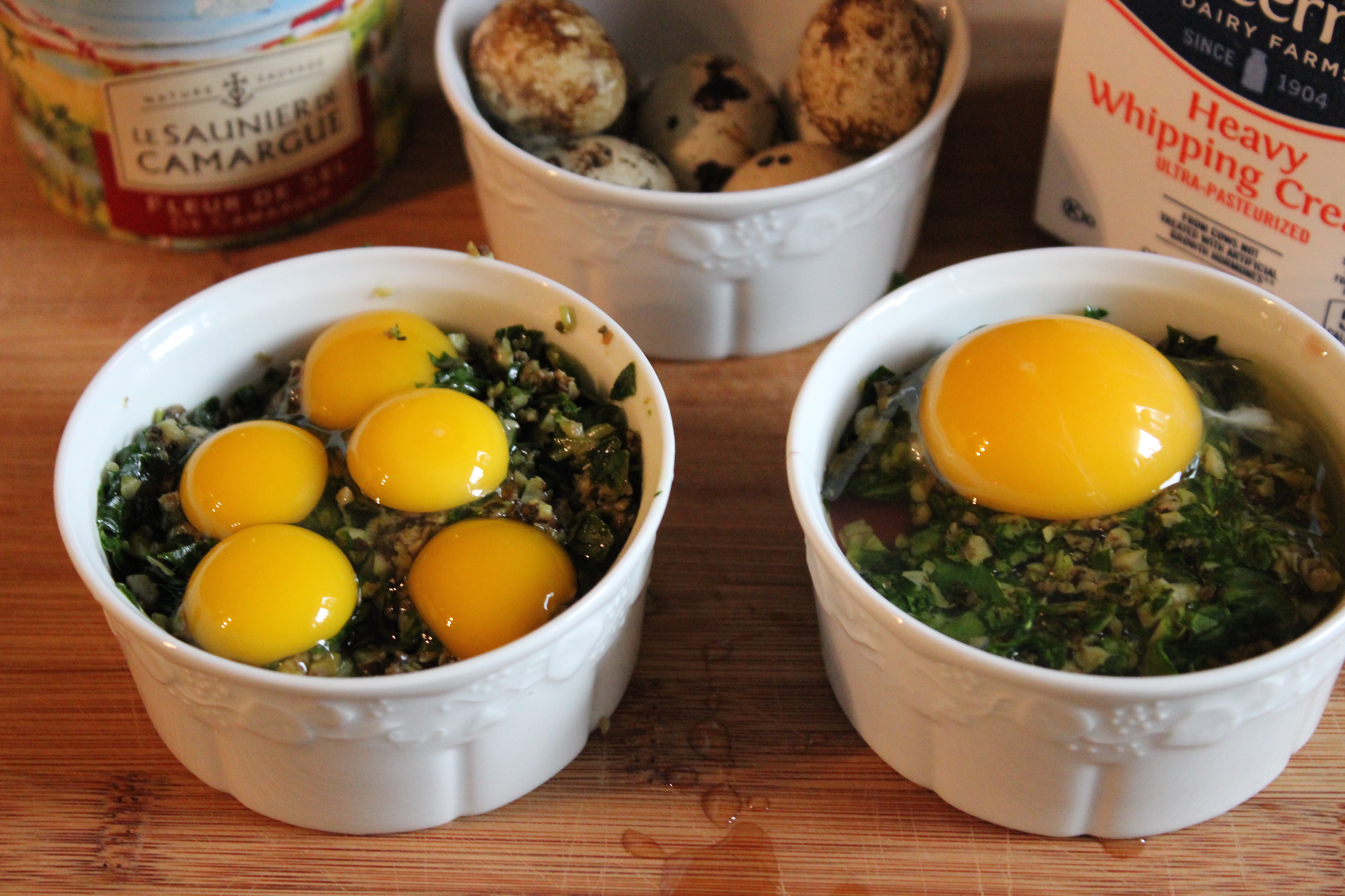 Bake at 350 for about 15 minutes, checking half-way through, until the yolk is just set to your liking. The tiny quail eggs will only take about 8 minutes.