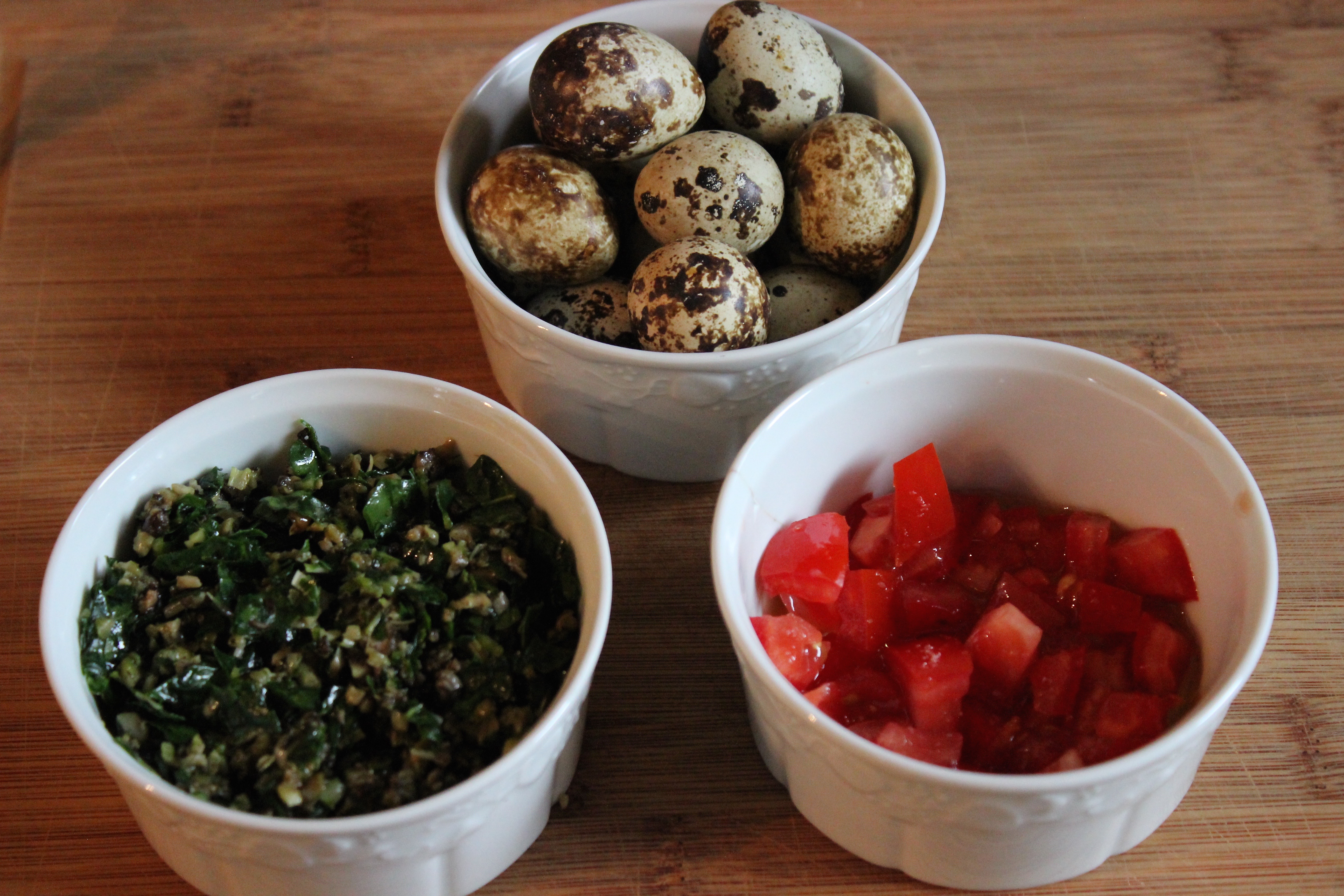 Here’s how it went down. Pour one teaspoon of basil olive oil (or any olive oil of your preference) in the bottom of a ramekin. I used a 6 oz. cup. Sprinkle a layer of chopped tomatoes on top. Spoon in 1-2 Tbls. of the mushroom mixture, depending on the size of your ramekin. Build up the filling, leaving about an inch to the top. This is so the egg on top of the filling it will make a statement, “Look at me!” and not “I’m a shrinking violet.” Crack an egg on top, or if you wish to be a bit extravagant and avant garde, use quail eggs as I have done here. I admire their delicate shells, so uniquely speckled. Maybe I used too many!!